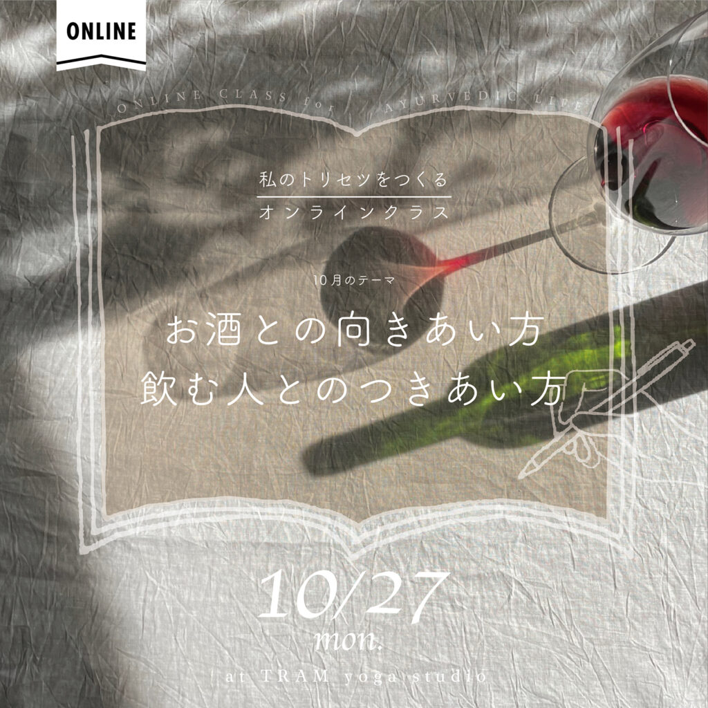 ※このクラスでお伝えする内容は、アーユルヴェーダの基本理論に基づく生活アドバイスやホームレメディであり、治療を目的としたものではありません。ご自身の判断のもと生活に取り入れてアーユルヴェーディックなまいにちをお楽しみください。なお、健康問題や不調のある方は、医療機関による診断・処方を優先してください。
