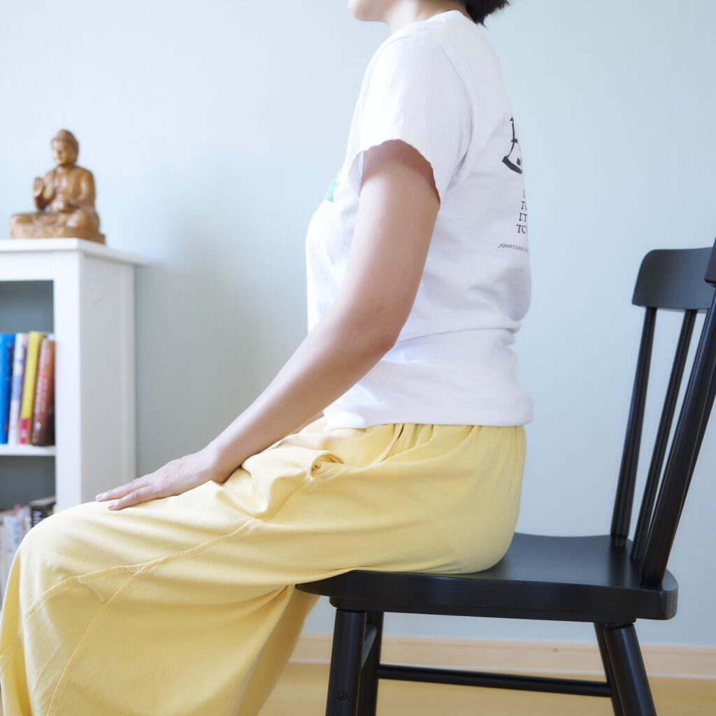 座布などを敷き、お尻を膝よりも少し高くして座ります。椅子に座って行う場合は背もたれに寄りかからず、足を腰幅に開き裏全体を床に下ろしておきます。ここでは土台となる部分が安定して背骨が伸びていることが大切です。手のひらを下に向け、腿の上に置きます。背筋を伸ばし、胸、肩、顔を柔らかく保ちましょう。